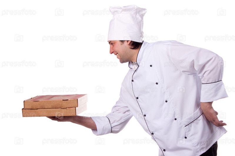 Портрет шеф-повара с пиццами в коробках