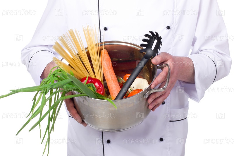 Шеф-повар держит кастрюлю с сырыми овощами и макаронами