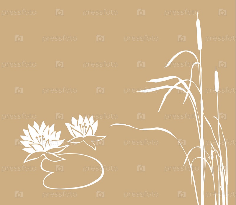 Белые силуэты кувшинки и тростника на коричневом фоне
