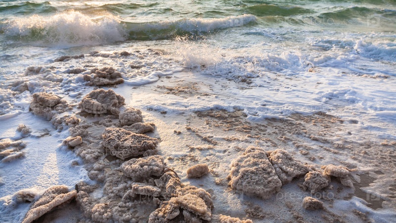 Кристаллическая соль на берегу Мертвого моря на закате