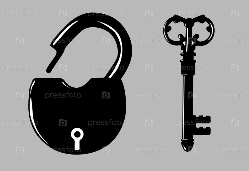 Черные силуэты висячего замка и ключа на сером фоне