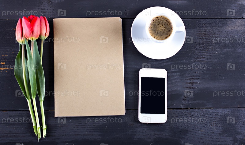 Кофейная чашка с блокнотом, мобильный телефон и тюльпаны на деревянном столе