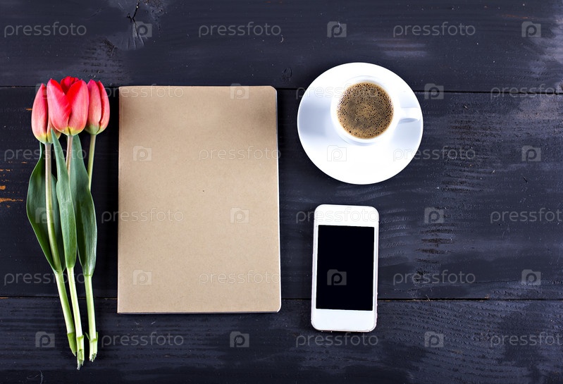 Кофейная чашка с блокнотом, мобильный телефон и тюльпаны на деревянном столе