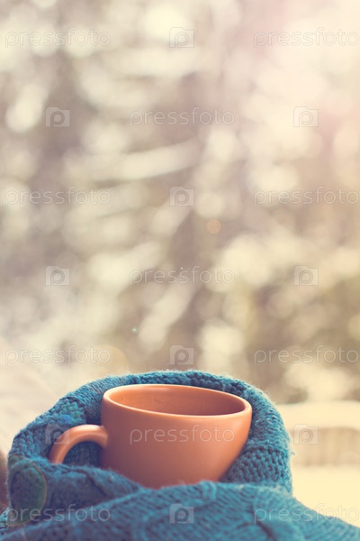 Чашка с горячим напитком на фоне зимнего леса
