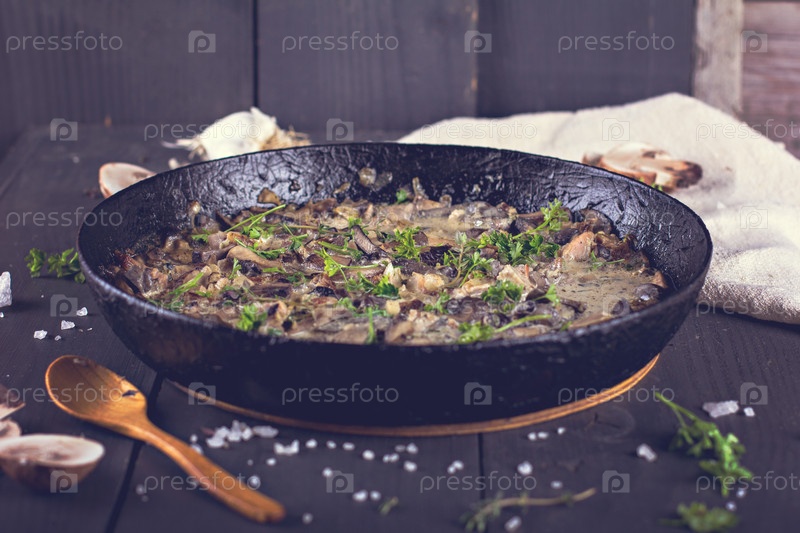 Жареные грибы шампиньоны с мясом, маслом, петрушкой