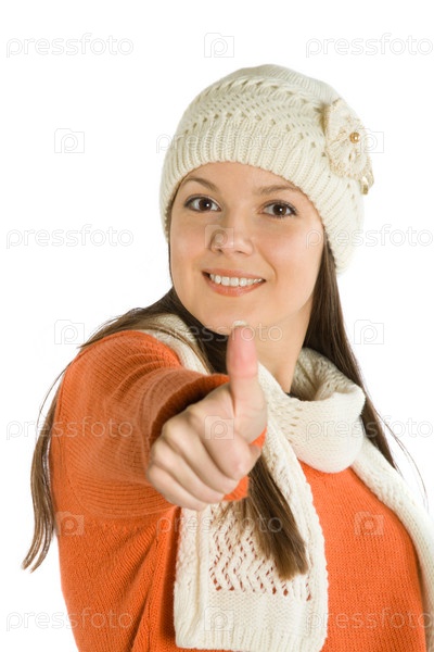 Молодая женщина в шапке и шарфе дает знак поднятия большого пальца