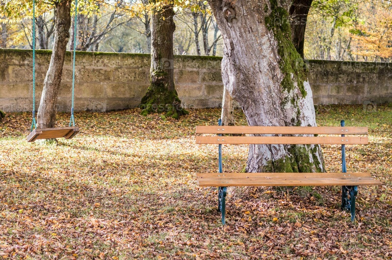 Деревянная скамья и качели в осеннем саду