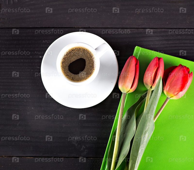 Кофе с записной книжкой и тюльпанами