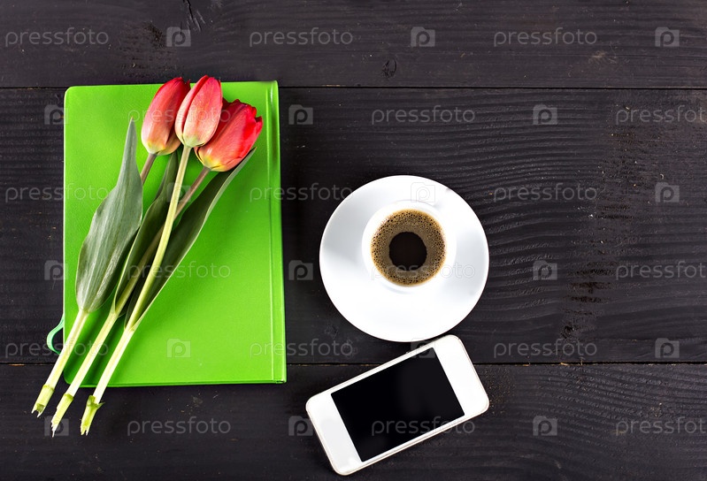 Кофе, блокнот, мобильный телефон и тюльпаны
