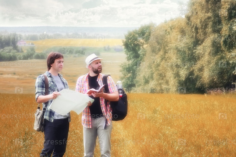 Туристы с картой в поле