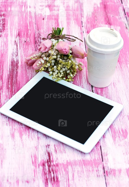 Планшетный компьютер, кофе и цветы
