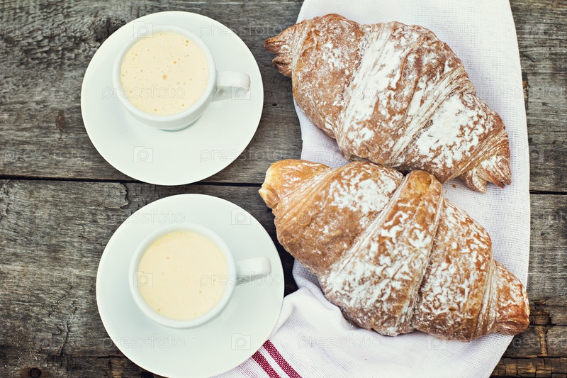Две чашки кофе «эспрессо» и круассаны на деревянном столе