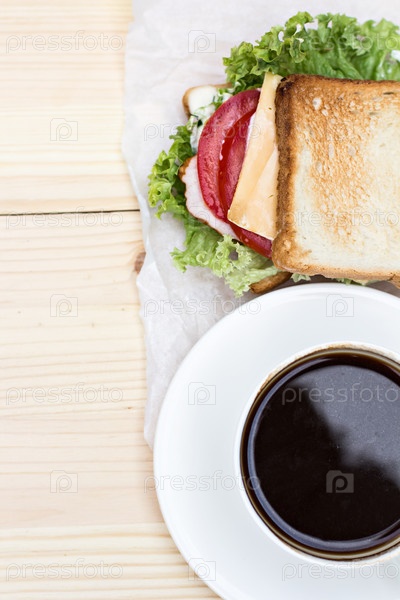 Сэндвич и чашка черного кофе на столе