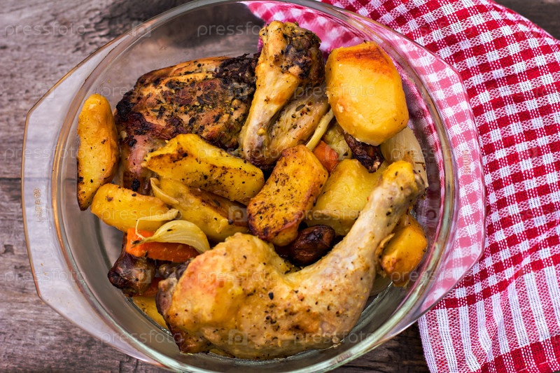 Запеченные кусочки курицы с картофелем, зеленью и чесноком на деревянном столе