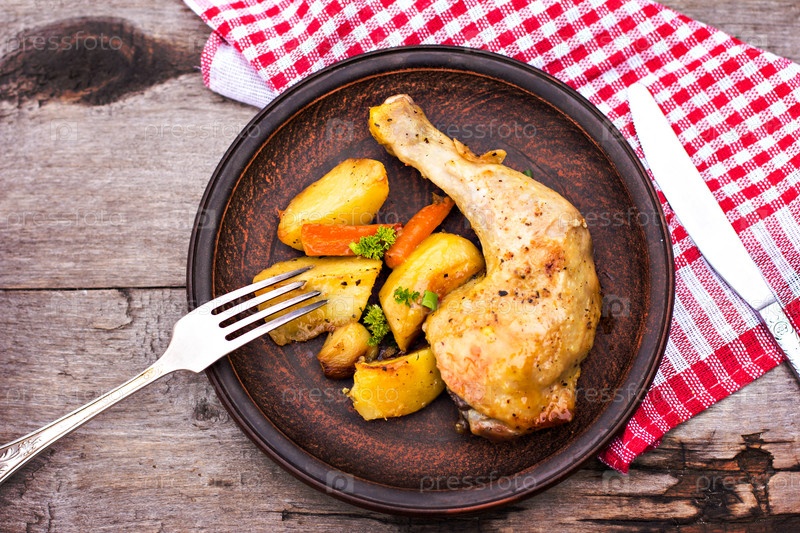 Запеченные кусочки курицы с картофелем, зеленью и чесноком на деревянном столе