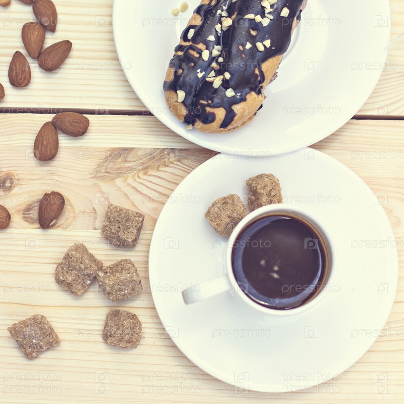 Шоколадный эклер с чашкой кофе