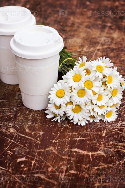 Кофе и букет ромашек