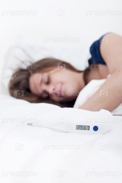 Градусник с температурой 39,6 на фоне больной девушки