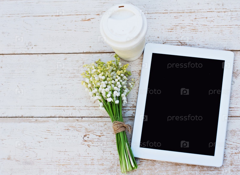 Планшетный компьютер, стакан кофе и ландыши