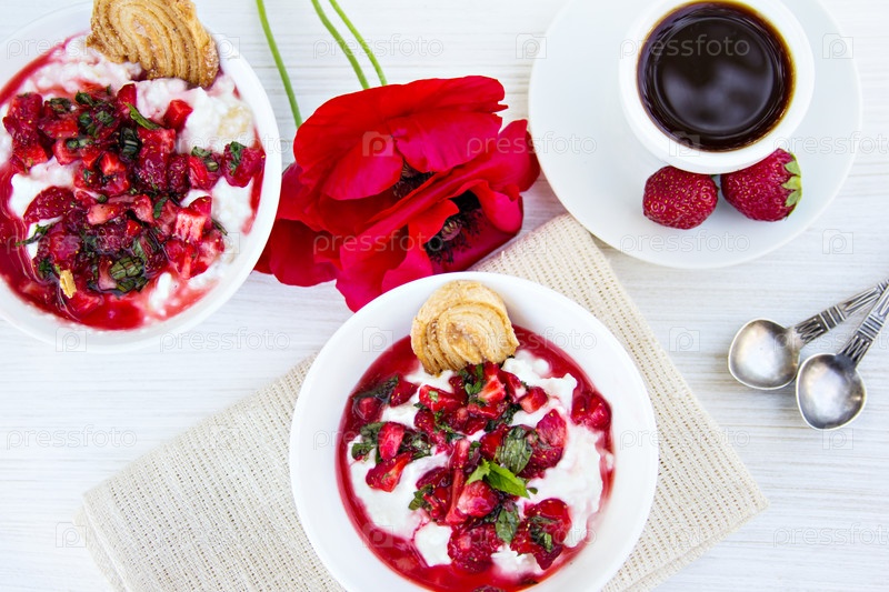 Творог с клубникой и кофе