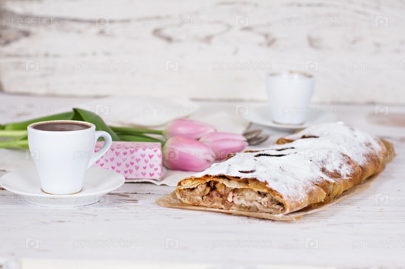 Пирог и весеннее украшение на белом фоне
