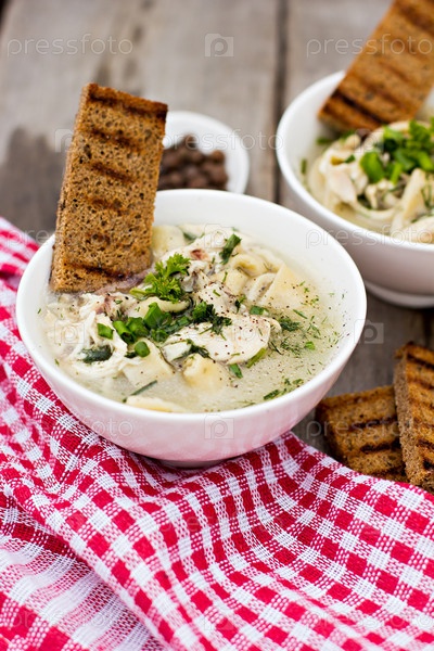 Чаша супа с лапшой и курицей на деревянном столе
