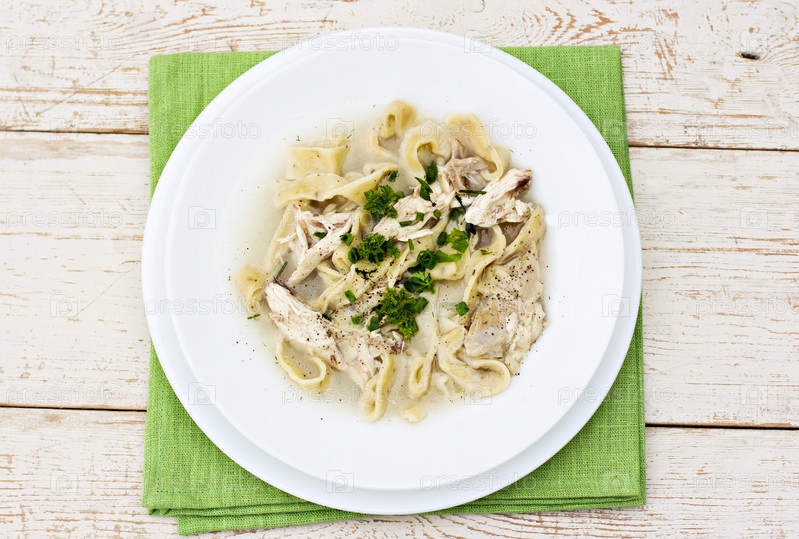 Чаша супа с лапшой и курицей на деревянном столе