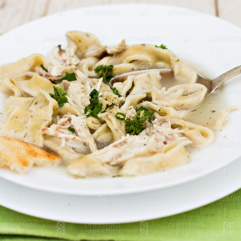 Чаша супа с лапшой и курицей на деревянном столе