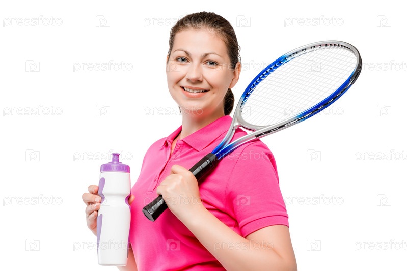 Девушка позирует с ракеткой после тренировки на белом фоне