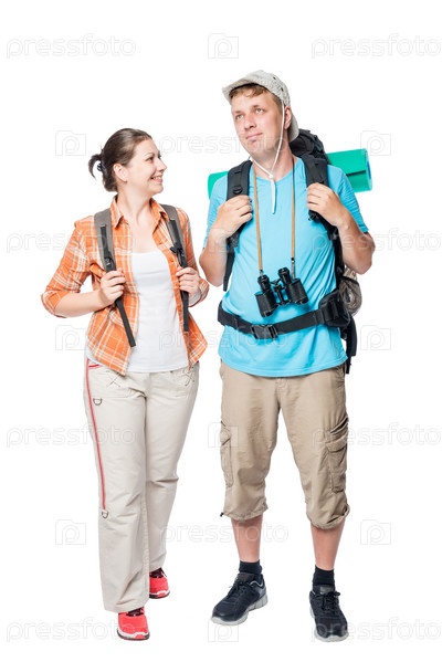 Улыбающиеся путешественники с рюкзаками на белом фоне