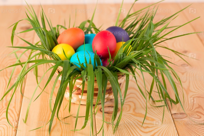 Пышная весенняя трава в корзине с пасхальными яйцами