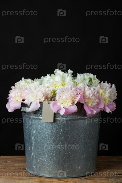 Пионы в металлическом ковше