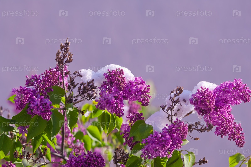 Сирень после весеннего снегопада в солнечный день