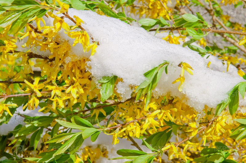 Цветущая форзиция после снегопада