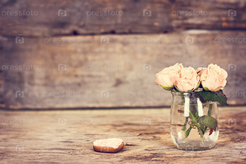 Небольшой букет из розовых роз на деревянном фоне