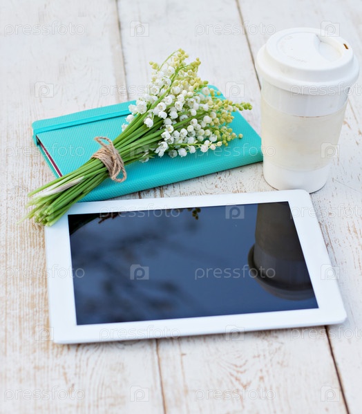 Дневник, планшетный компьютер и ландыши на столе