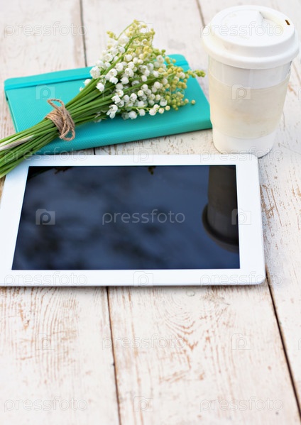 Дневник, планшетный компьютер и ландыши на столе