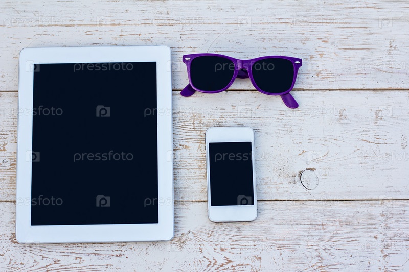 Планшетный компьютер, мобильный телефон и солнцезащитные очки на деревянном столе