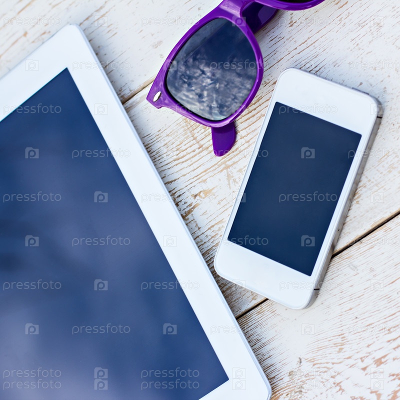 Планшетный компьютер, мобильный телефон и солнцезащитные очки на деревянном столе