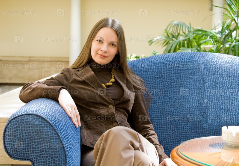 Молодая женщина, сидящая на голубом диване