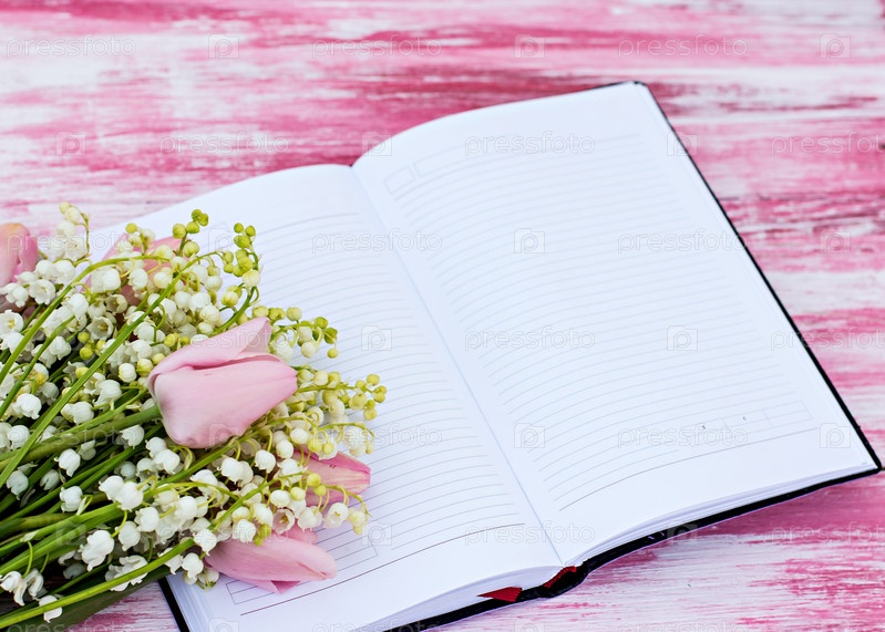Записная книжка и букет из ландышей и тюльпанов