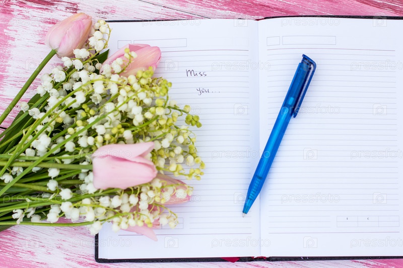 Надпись «скучаю по тебе» и букет ландышей и тюльпанов