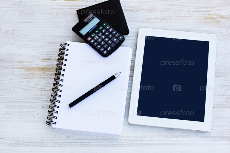 Планшетный компьютер, дневник, калькулятор, кошелек и ручка