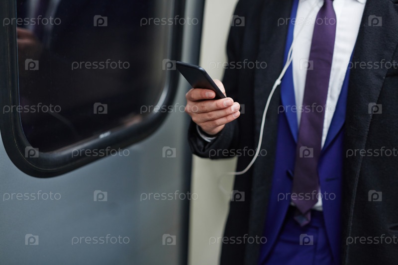 Бизнесмен, использующий смартфон в поезде метро
