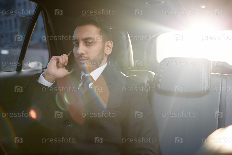 Уверенный бизнесмен, звонящий по телефону из автомобиля