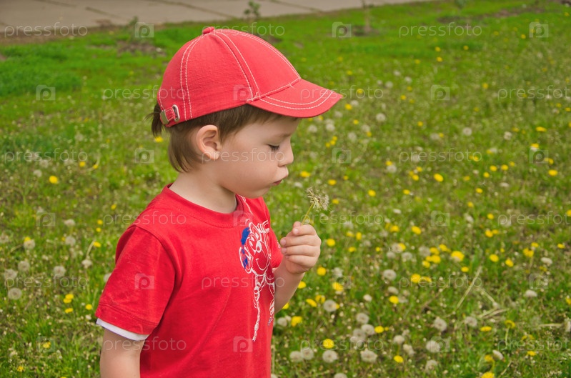 Мальчик в красной кепке сдувает одуванчик на фоне летнего газона