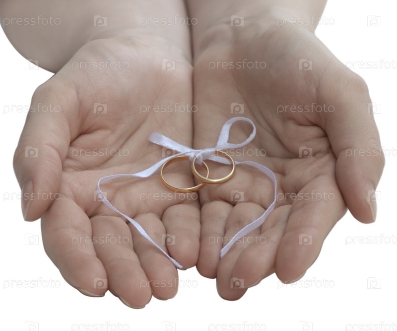 Обручальные кольца в ладонях на белом фоне