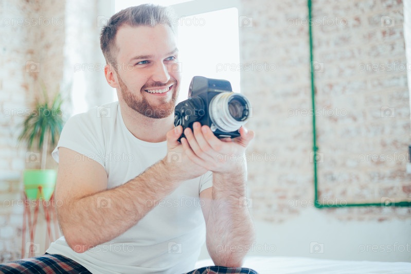 Красивый мужчина фотографирует дома