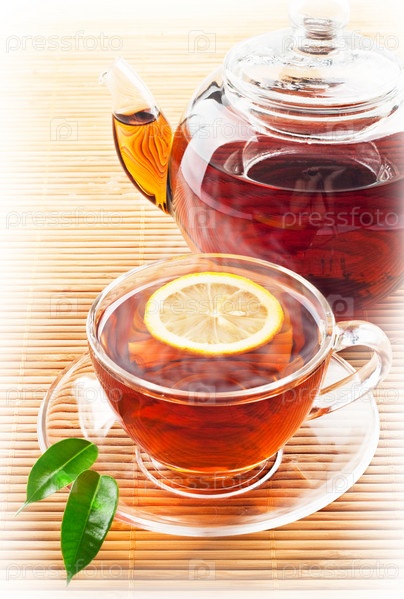 Горячий черный чай с лимоном в стеклянной чашке и в чайнике на столе