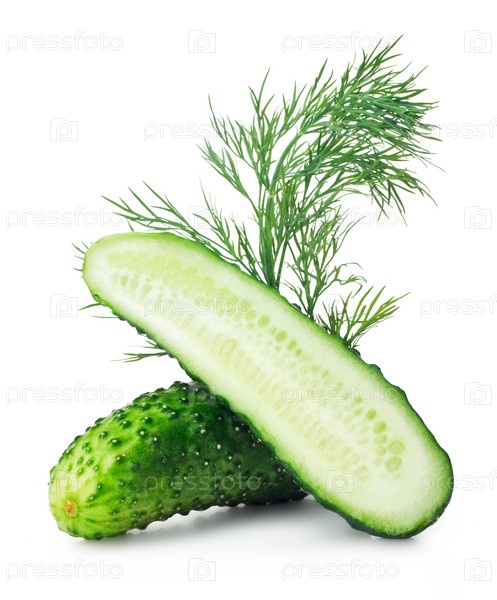 Свежие огурцы и зелень укропа на белом фоне